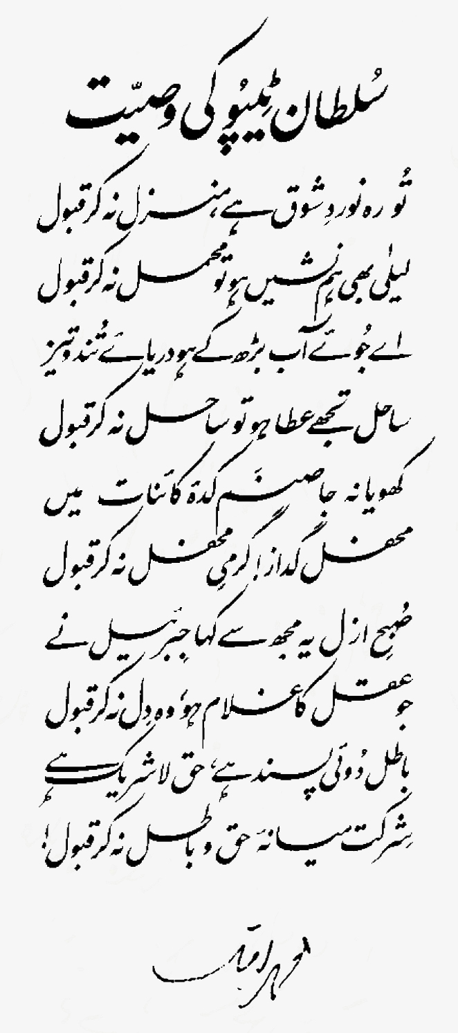 سلطان ٹیپو شیروں سے بڑھ کر بہادر تھا، اس نے کافر انگریزوں کی غلامی پر لڑتے ہوئے شہادت کی موت کو ترجیح دی۔ سلطان نے اپنی زندگی اور موت سے یہ پیغام دیا کہ راہِ عشق کے مسافر تو کبھی رکا نہیں کرتے، وہ تو عقبہ بن نافع کی مانند اپنے گھوڑے کو سمندر میں ڈال دیتے ہیں، ان کے سامنے کوئی کنارا کوئی دنیوی منزل، ’منزل‘ نہیں ہوا کرتی۔ عاشق کو اگر اس کی محبوبہ ’لیلیٰ‘ بھی اپنے کجاوے میں آکر ہم نشینی و تسکینِ وصل کی دعوت دے، تو حقیقی عشق کا مسافر اس دعوت کو قبول نہیں کیا کرتا۔ اگر سچا عاشق لیلیٰ جیسی کی ہم نشینی کو ٹھکرا سکتا ہے تو دنیا کے تخت و تاج، اموال و سواریاں تو بالکل ہیچ ہیں۔
