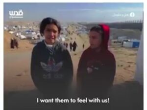 یہ محمد الشیبر کی ۱۰؍ ۱۱ سالہ بیٹی لیان الشیبر ہے۔ جو اپنی چھوٹی بہن کے ساتھ جنوبی غزہ میں اکیلی ہے۔ جس وقت وہ اپنے والدین اور دو بھائیوں موسیٰ اور ماہر کے ساتھ وسطِ غزہ سے جنوب کی طرف سفر کر رہی تھیں، اسرائیلی فوج نے ان کے دیگر اہلِ خانہ کو وسط میں ہی روک لیا اور صرف ان دو چھوٹی بچیوں کو جانے کی اجازت ملی۔ انہوں نے ہفتوں سے اپنے گھر والوں کو نہیں دیکھا، ان کی آوازیں نہیں سنیں، اور وہ انہیں بے حد و بے تحاشا یاد کرتی ہیں۔ وہ دنیا سے کیا چاہتی ہیں؟ صرف یہ کہ …… اپنے دلوں میں ہمارے لیے کچھ احساس پیدا کرو!