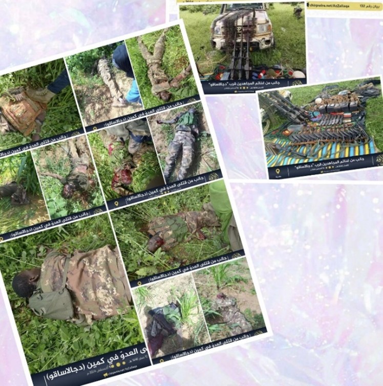 - ۹اگست ۲۰۲۴ء: جماعت نصرۃ الاسلام والمسلمین نے روسی اتحادی برکینافاسو کے ایک بڑے فوجی قافلے پر حملہ کیاجس کے نتیجے میں ۱۴۸ فوجی اہلکار ہلاک اور ۱۱۶ گاڑیاں تباہ ہوئیں جن میں ۷ بکتر بند گاڑیاں، ۱۶ موٹر سائیکلیں، ۳۸ میڈیم مشین گنیں شامل ہیں۔ ۷۰ سے زائد کلاشن کوف ، ۶ عدد 12.7MM دوشکا، ۱ عددمشین گن، ۲۱ آر پی جی (راکٹ لانچر)، ۳ عدد مارٹر، ۶عدد پستول اور اس کے علاوہ دیگر عسکری سازوسامان غنیمت میں حاصل ہوا۔